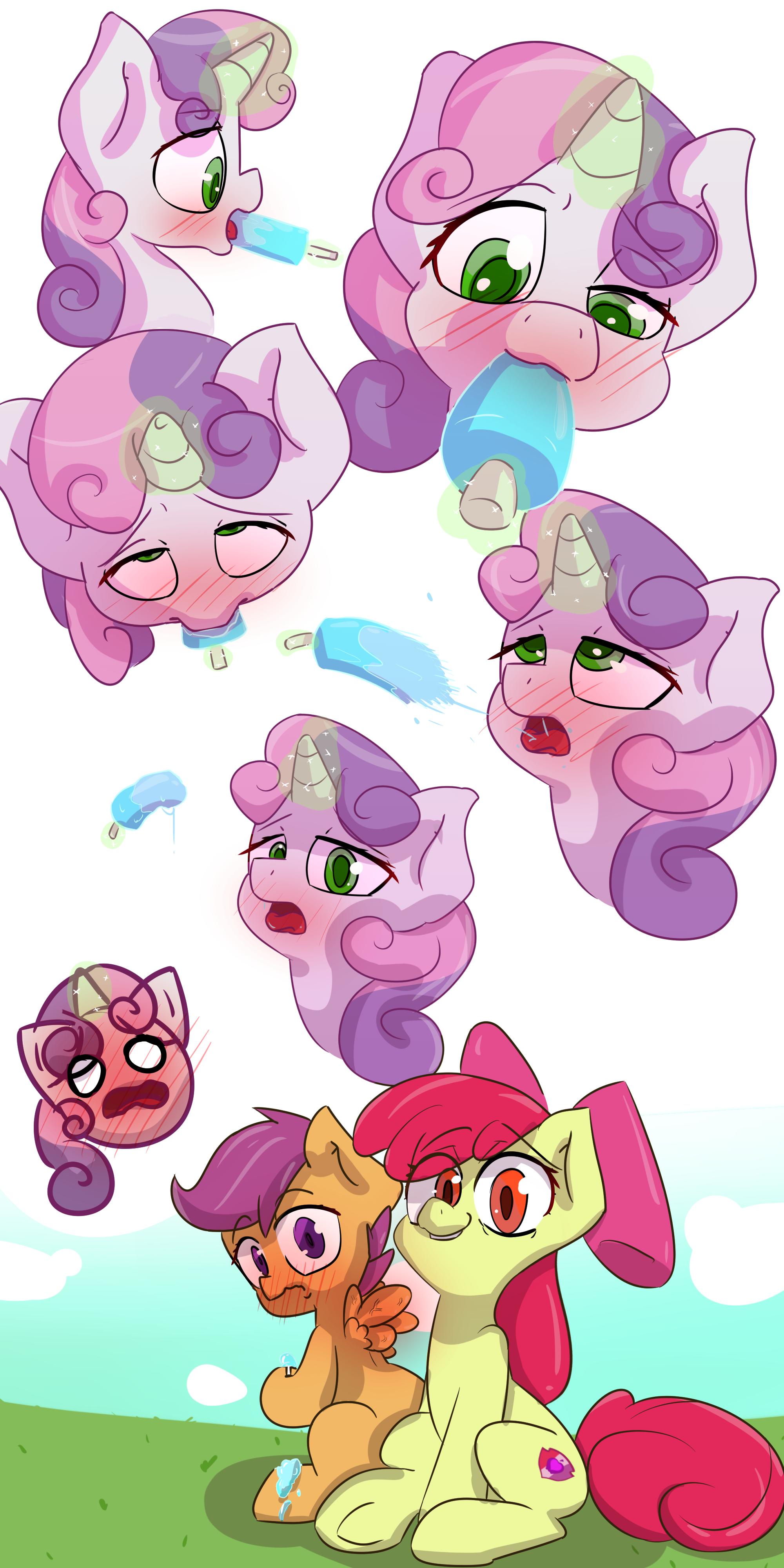 The queen propped up her head on the bottom of her hoof by twisting her foreleg in a way that would break on a pony, shoving the joint into some unfortunate children who could do nothing but be moved not quite out of the way. Not all of the children around her thorax could she see, she remembered as several of them grouped around her stomach started to kick it tirelessly, reinvigorated by the meal she’d just consumed. Her stomach wasn’t yet empty, she noticed with a burp; a pink cloud shaped like a heart left her throat before breaking and then dissipating into the air around her, before she could suck it back inside. She scowled at the wasted food, but reminded herself that the foals around her stomach were always bigger, and would be worked harder. She was made to burp again, but kept her mouth closed and swallowed her food a second time. Queen Chrysalis sighed. There was no mirror with which she could remind herself of her beauty—none in the hive were big enough—and she could only vaguely see herself in the reflection of her gut, which failed to satisfy her. She wanted to bask in her own enormity, the literal glow of her maternity, and yet was denied this. She could feel her womb’s outline, and across it could begin to make out the hundreds of new body parts shoved against its entire surface, but this failed to give her a detailed sense of her scale; in her deepest depths, she felt absolutely nothing—for while all of the little brains and nerves and body parts belonged to her, they also belonged not to her more, with the evidence being their obscurity to her—leaving only high pressure building up against her thinning membrane, organs, and increasingly her rear to remind her that she was still growing bigger every moment.