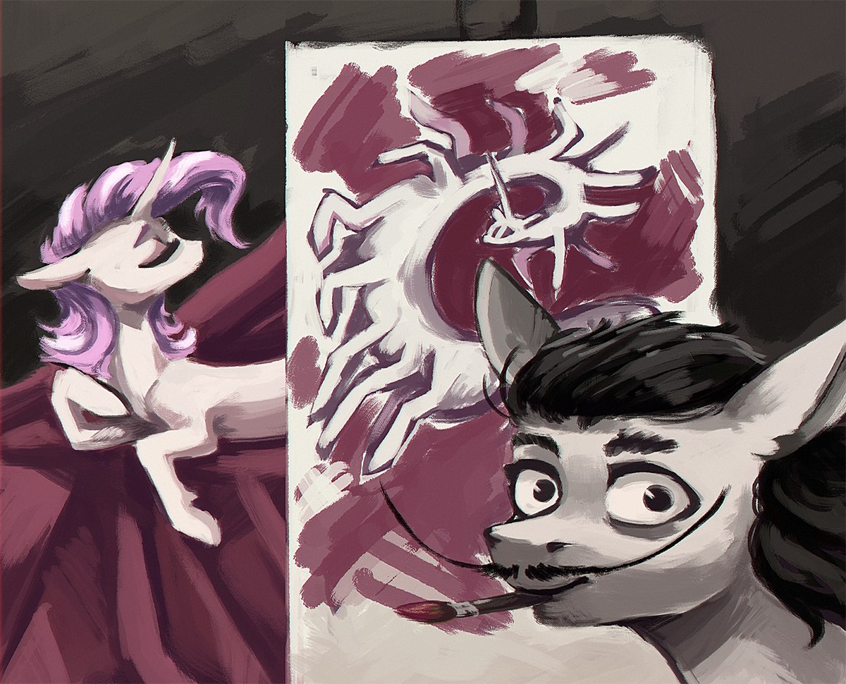 The queen propped up her head on the bottom of her hoof by twisting her foreleg in a way that would break on a pony, shoving the joint into some unfortunate children who could do nothing but be moved not quite out of the way. Not all of the children around her thorax could she see, she remembered as several of them grouped around her stomach started to kick it tirelessly, reinvigorated by the meal she’d just consumed. Her stomach wasn’t yet empty, she noticed with a burp; a pink cloud shaped like a heart left her throat before breaking and then dissipating into the air around her, before she could suck it back inside. She scowled at the wasted food, but reminded herself that the foals around her stomach were always bigger, and would be worked harder. She was made to burp again, but kept her mouth closed and swallowed her food a second time. Queen Chrysalis sighed. There was no mirror with which she could remind herself of her beauty—none in the hive were big enough—and she could only vaguely see herself in the reflection of her gut, which failed to satisfy her. She wanted to bask in her own enormity, the literal glow of her maternity, and yet was denied this. She could feel her womb’s outline, and across it could begin to make out the hundreds of new body parts shoved against its entire surface, but this failed to give her a detailed sense of her scale; in her deepest depths, she felt absolutely nothing—for while all of the little brains and nerves and body parts belonged to her, they also belonged not to her more, with the evidence being their obscurity to her—leaving only high pressure building up against her thinning membrane, organs, and increasingly her rear to remind her that she was still growing bigger every moment.