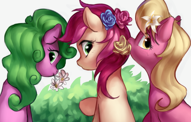 I didn't catch that image when it was posted, but that's cute. That's really cute. With all the magic in Equestria, looks like Roseluck is working her own magic on those flowers. I wonder if like the weather, flowers needs flower ponies to give them direction on what to be? If the specifics of the flower depends just as much on the pony managing them as it does the flower type itself?