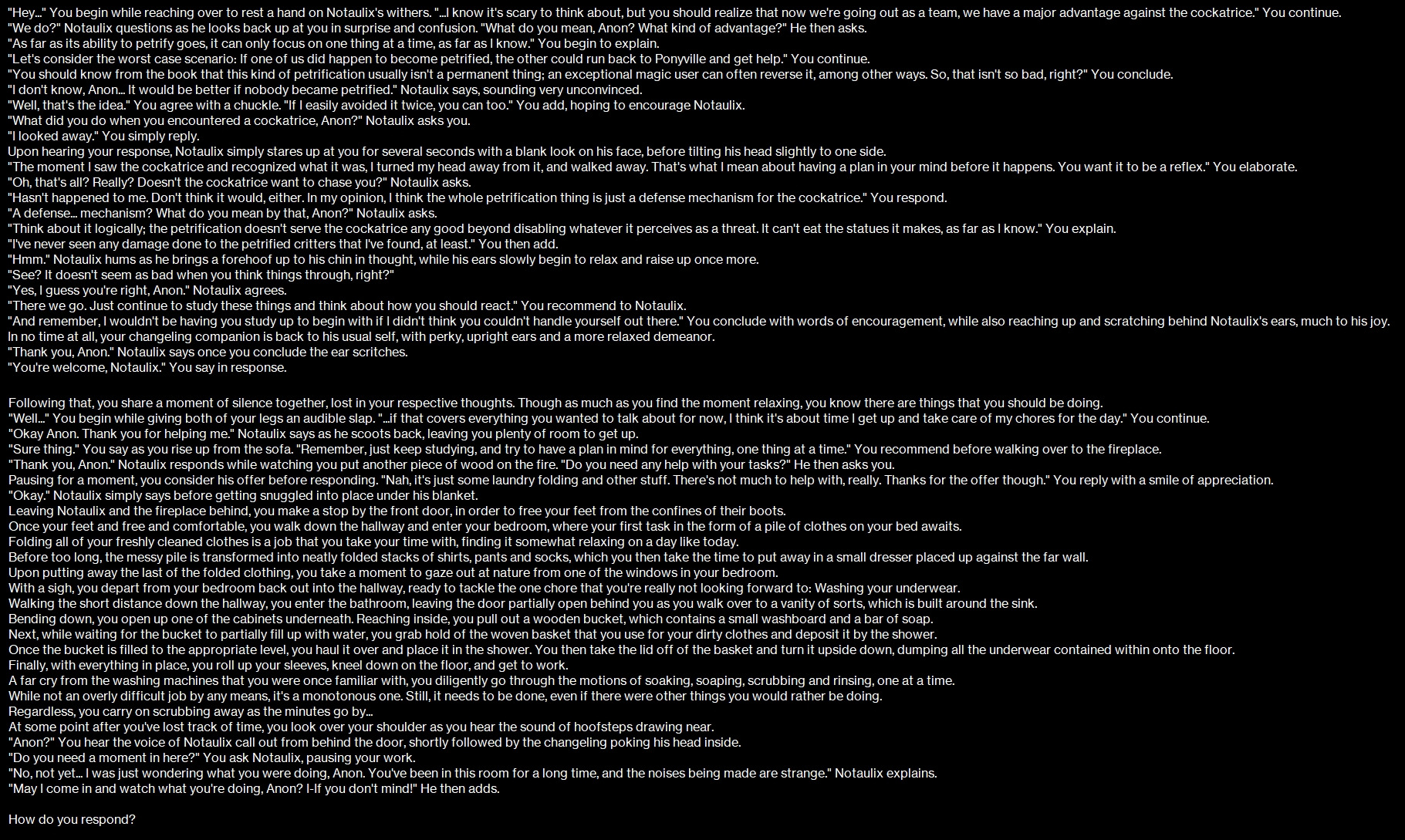 "Thank you, Anon." Notaulix responds while watching you put another piece of wood on the fire. "Do you need any help with your tasks?" He then asks you.