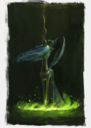 >Black is replaced by white, and before you Chrysalis now stands in the body of a white unicorn stallion.