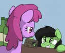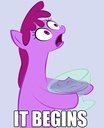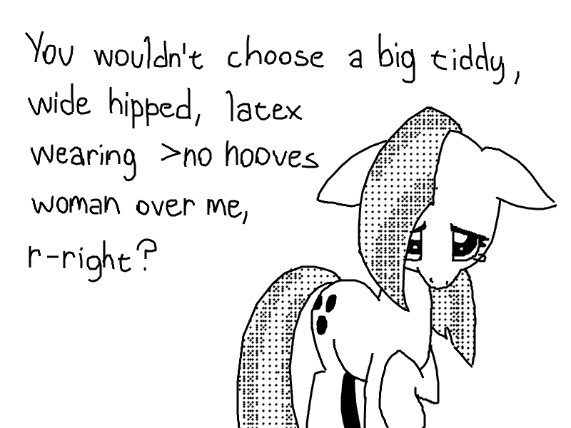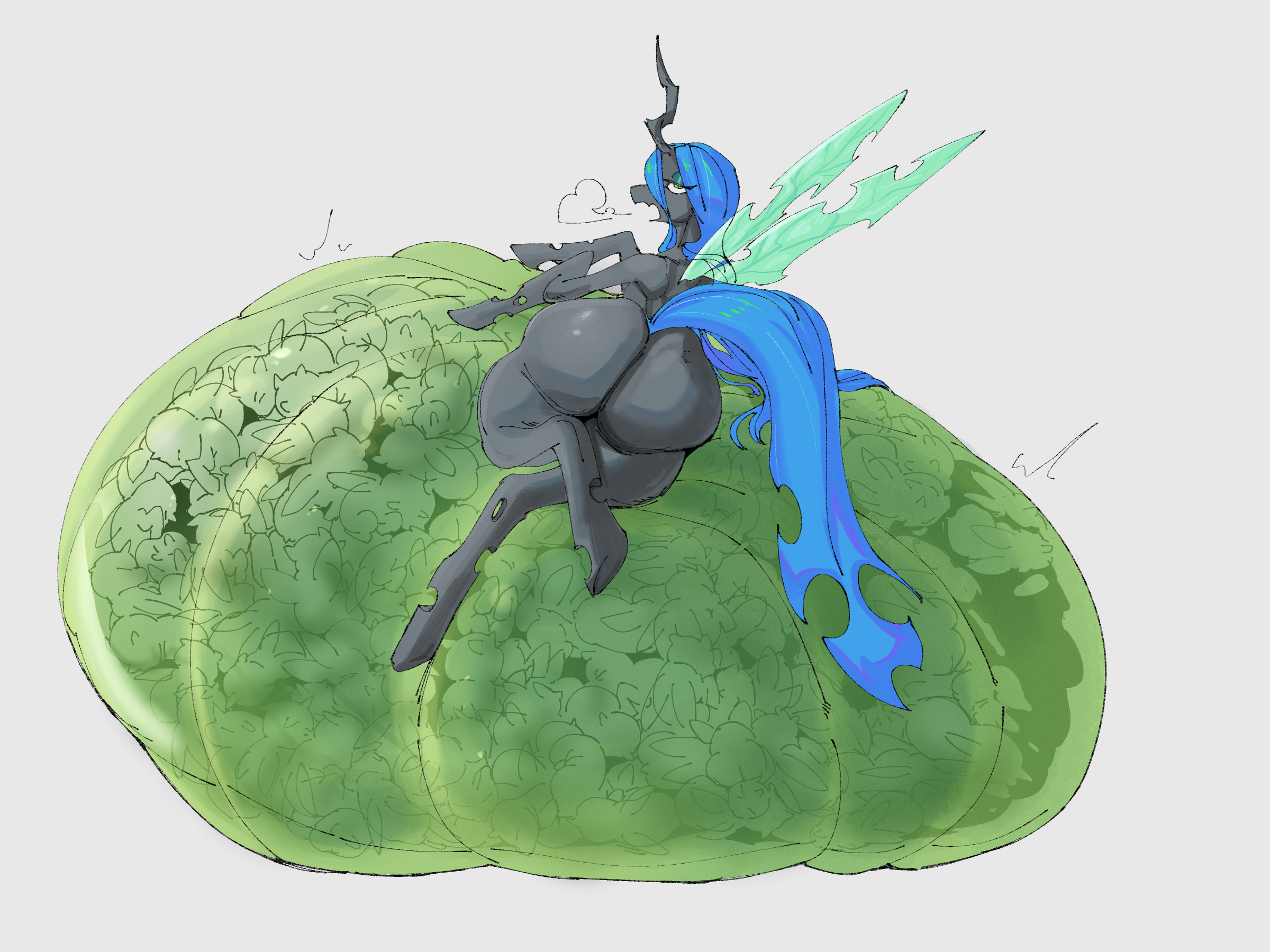 The queen propped up her head on the bottom of her hoof by twisting her foreleg in a way that would break on a pony, shoving the joint into some unfortunate children who could do nothing but be moved not quite out of the way. Not all of the children around her thorax could she see, she remembered as several of them grouped around her stomach started to kick it tirelessly, reinvigorated by the meal she’d just consumed. Her stomach wasn’t yet empty, she noticed with a burp; a pink cloud shaped like a heart left her throat before breaking and then dissipating into the air around her, before she could suck it back inside. She scowled at the wasted food, but reminded herself that the foals around her stomach were always bigger, and would be worked harder. She was made to burp again, but kept her mouth closed and swallowed her food a second time. Queen Chrysalis sighed. There was no mirror with which she could remind herself of her beauty—none in the hive were big enough—and she could only vaguely see herself in the reflection of her gut, which failed to satisfy her. She wanted to bask in her own enormity, the literal glow of her maternity, and yet was denied this. She could feel her womb’s outline, and across it could begin to make out the hundreds of new body parts shoved against its entire surface, but this failed to give her a detailed sense of her scale; in her deepest depths, she felt absolutely nothing—for while all of the little brains and nerves and body parts belonged to her, they also belonged not to her more, with the evidence being their obscurity to her—leaving only high pressure building up against her thinning membrane, organs, and increasingly her rear to remind her that she was still growing bigger every moment.